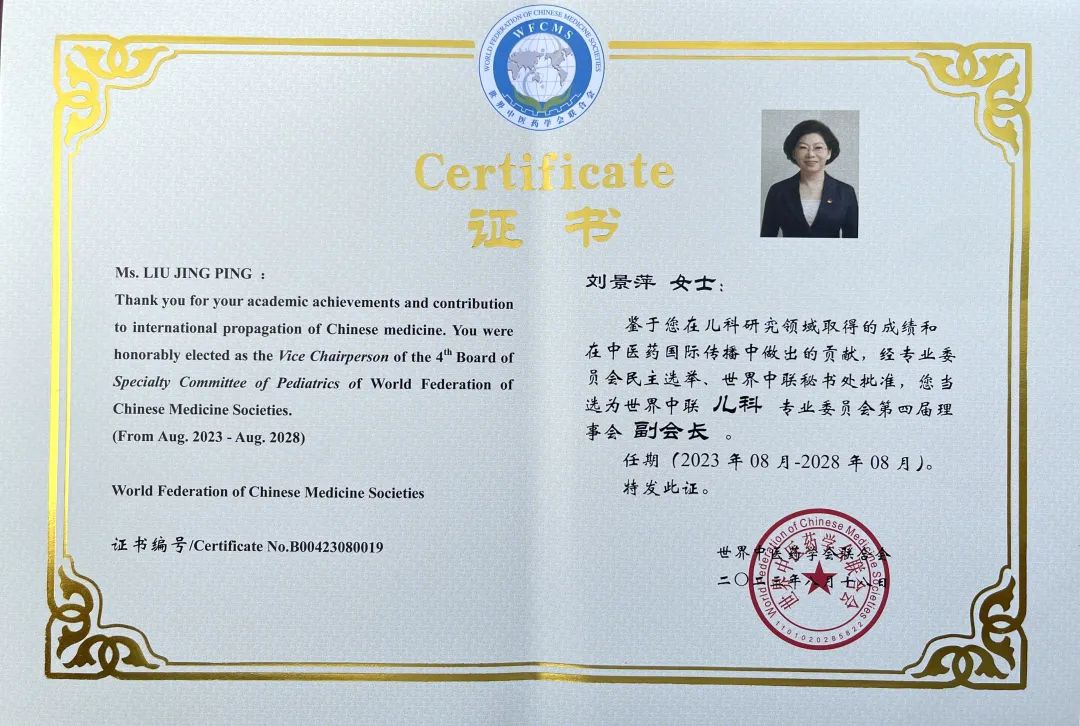 彩虹多多药业集团党委书记、董事长刘景萍当选世界中医药学会联合会儿科专业委员会第四届理事会副会长